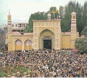 整个喀什,以著名的大清真寺所在的艾提尕广场为中心,四条整齐宽阔的大街组成“十”字,古老的艾提尕大清真寺富丽堂皇,雄伟高大,高耸于广场的西北角,是全疆乃至全国最大的伊斯兰教礼拜寺,在国内外宗教界的影响非比寻常。每逢重大节日,在寺内外跪拜的穆斯林可达二三万之多。